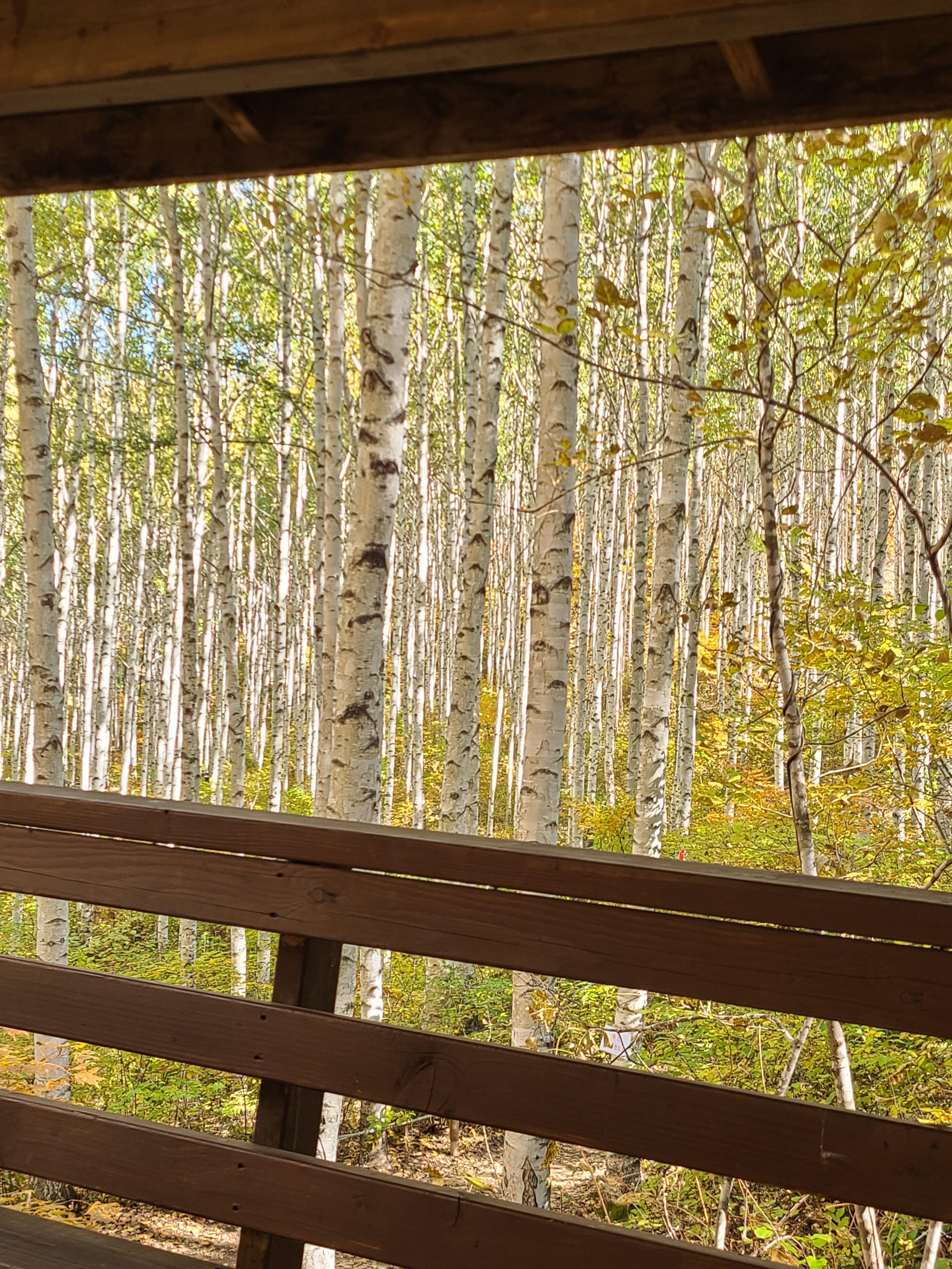 제일 꼭대기까지 오르니 자작나무숲이 보인다.